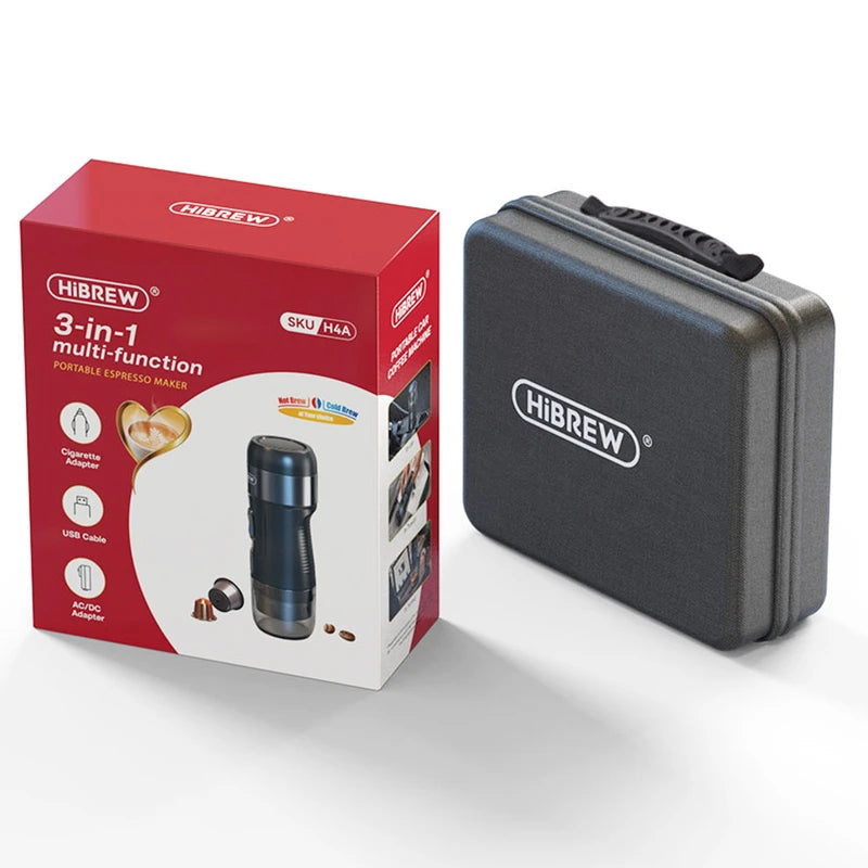 Machine à café H4A + 3 Portes capsules + Cuillère pour poudre de café + Adaptateur voiture* + Adaptateur USB + Prise secteur*.